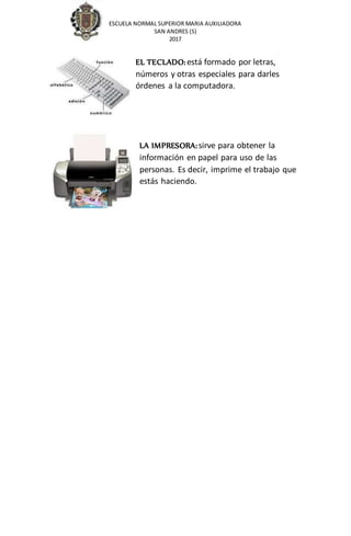 El documento describe las partes principales de una computadora, incluyendo el monitor, la CPU, el ratón, el teclado y la impresora. Explica que el monitor muestra la información, la CPU es la parte principal que contiene el procesador, el ratón y el teclado se usan para ingresar datos, y la impresora imprime la salida. El documento también incluye una actividad para emparejar cada parte del computador con su descripción.