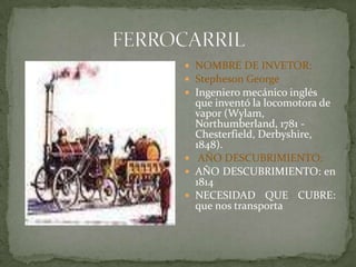 El documento describe la invención de varios importantes inventos como el ferrocarril, la bicicleta, el helicóptero, el televisor y el teléfono. Detalla el nombre de cada inventor, el año de descubrimiento y la necesidad que cubrió cada invento. Al final, la persona expresa que se siente impactada por la tecnología y cómo el ser humano continúa impactándonos con nuevas invenciones.