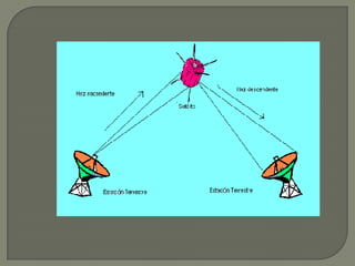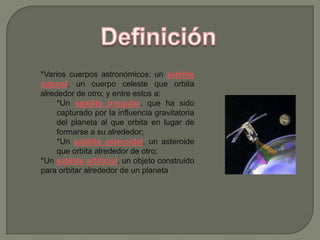El documento habla sobre diferentes tipos de satélites. Menciona satélites naturales que orbitan planetas, satélites irregulares capturados por la gravedad de un planeta, y satélites artificiales construidos por el hombre para orbitar la Tierra y otros usos como comunicaciones, observación militar y civil. También discute brevemente la historia, estructura, funcionamiento, ventajas y desventajas de los satélites.