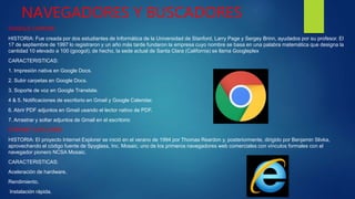 El documento describe varios navegadores y buscadores de Internet como Google Chrome, Internet Explorer, Mozilla Firefox y Opera, detallando brevemente su historia y características principales. También resume conceptos como redes sociales, correo electrónico y delitos informáticos.
