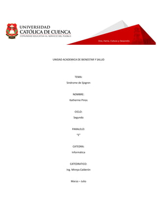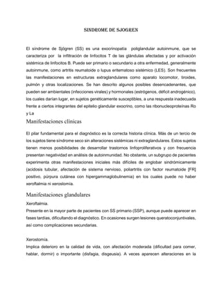 El documento describe el síndrome de Sjögren, una enfermedad autoinmune que causa sequedad en los ojos y boca. Se caracteriza por la infiltración de linfocitos T en las glándulas afectadas y la activación de linfocitos B. Las manifestaciones incluyen xeroftalmia, xerostomía, tumefacción parotídea y otras xerosis. También puede causar síntomas extraglandulares como osteomusculares, cutáneas y en el aparato respiratorio. El diagnóstico se basa