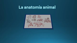 La anatomía estudia las características y relaciones de los órganos de los organismos vivos. El primer estudio anatómico data del año 1600 a.C. en Egipto, aunque sabían poco del funcionamiento de los órganos. Aristóteles aumentó los conocimientos en el siglo IV a.C. mediante disecciones humanas. Los romanos y árabes también avanzaron en la anatomía antes del renacimiento, cuando científicos como Vesalio establecieron la anatomía moderna basada en observaciones directas.