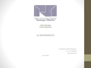 La informática estudia el tratamiento automático de la información mediante sistemas computacionales. Tiene sus orígenes en el siglo XVII con la invención de máquinas calculadoras y fue desarrollándose con figuras como Charles Babbage, considerado el padre de la computación, y George Boole, quien creó el álgebra booleana. Actualmente, la informática se aplica a numerosas áreas y es indispensable en la sociedad moderna.