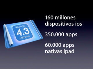 La presentación destaca las cifras clave del ecosistema de Apple como 160 millones de dispositivos iOS, 350.000 aplicaciones disponibles y 10.000 millones de descargas totales, mostrando la popularidad y alcance de los productos de la compañía.