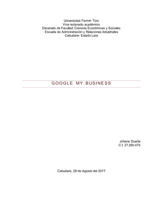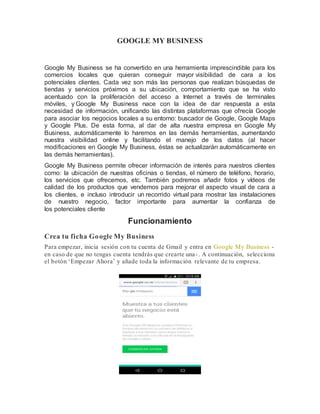 Google My Business permite a las empresas gestionar su presencia en línea al proporcionar información relevante como la ubicación, horarios y servicios en Google, Maps y Google Plus. Las empresas verificadas son más confiables para los clientes y pueden interactuar mediante reseñas y fotos. Aunque requiere esfuerzo para posicionarse, Google My Business ofrece estadísticas y publicidad para dar a conocer el negocio.