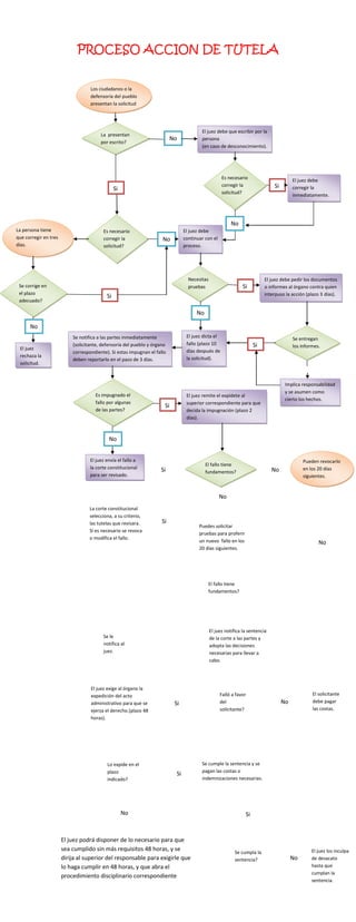 El proceso de acción de tutela en Colombia consta de varios pasos. Primero, los ciudadanos o la defensoría del pueblo presentan una solicitud ante cualquier juez. Luego, el juez solicita documentos e informes a la entidad contra la que se presentó la acción y dicta un fallo en un plazo de 10 días. Finalmente, el fallo se notifica a las partes y puede ser impugnado en los 20 días siguientes ante la Corte Constitucional o el superior jerárquico del juez original.
