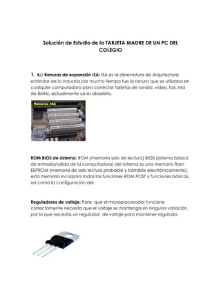 Este documento describe las características y componentes de una tarjeta madre, incluyendo ranuras de expansión, reguladores de voltaje, conectores para disquetera, memoria, procesador y fuente de alimentación. También explica cómo instalar correctamente un procesador, memoria RAM y conectar los cables de alimentación en la tarjeta madre.