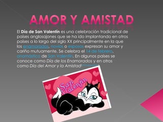 El Día de San Valentín se celebra el 14 de febrero y conmemora el martirio de San Valentín. Originalmente una tradición anglosajona, ahora se celebra en muchos países donde las parejas y enamorados se expresan su afecto mutuo a través de regalos como flores y chocolate.
