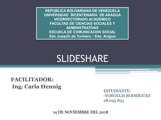 Slideshare es una plataforma web que permite a los usuarios almacenar presentaciones como diapositivas de PowerPoint y compartirlas públicamente o privadamente. Los usuarios pueden subir presentaciones en formatos como PDF, PowerPoint y OpenOffice, las cuales son convertidas a formato Flash para su visualización. Slideshare ofrece características como almacenar y organizar presentaciones por categorías, incrustar videos de YouTube, y medir el número de visitas recibidas.