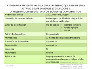 Este documento presenta instrucciones para un proyecto de una línea de tiempo sobre la historia de Internet en México. Los estudiantes deben investigar en Internet y crear una línea de tiempo con años y descripciones clave. La presentación debe guardarse en una carpeta específica con el nombre, grado y fecha del estudiante.