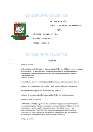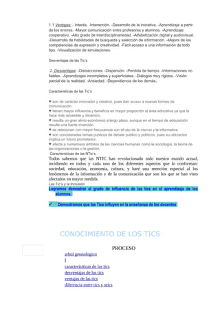 Este documento presenta información sobre las tecnologías de la información y comunicación (TIC) y las nuevas tecnologías de la información y comunicación (NTIC). Define TIC y NTIC, describe las diferencias entre ellas, y discute las ventajas, desventajas y características de ambas. También cubre cómo las TIC pueden promover el desarrollo de competencias y ser utilizadas para la evaluación de aprendizaje.