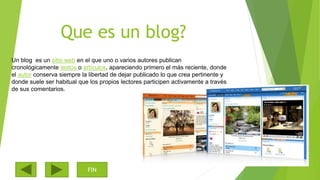 Este documento describe las herramientas Blogger, Tumblr y WordPress que se pueden usar para crear un blog. Explica las características y ventajas de cada plataforma, como la personalización que ofrece Blogger, la facilidad de Tumblr para publicar contenido multimedia y texto corto, y las opciones más limitadas pero gratuitas de WordPress. También incluye los pasos para crear un blog en Blogger, como elegir un título, URL y plantilla.
