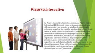 La Pizarra Interactiva consiste en un ordenador conectado a un proyector que muestra la señal del ordenador sobre una superficie lisa y rígida que permite controlar el ordenador y hacer anotaciones manuscritas sobre cualquier imagen proyectada, las cuales pueden guardarse, imprimirse, enviarse por correo electrónico o exportarse a otros formatos. La función principal de la pizarra es controlar el ordenador mediante esta superficie con un bolígrafo u otro dispositivo de forma interactiva.