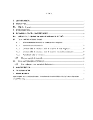 El documento es un trabajo académico sobre el uso de Microsoft Word, centrado en herramientas como secciones, tablas de contenido, tablas de ilustraciones e índices. Detalla métodos para crear y actualizar estos elementos en documentos, destacando su importancia en la presentación y estructura del contenido. Se concluye que dominar estas funciones es crucial para mejorar la calidad de los trabajos académicos y profesionales.
