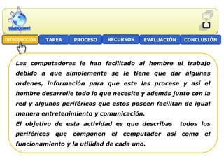 Este documento presenta una actividad sobre los periféricos de computadoras. Los estudiantes se dividirán en grupos para investigar y responder preguntas sobre qué es una computadora, tres periféricos de entrada y salida, los aportes de las computadoras al desarrollo humano y los periféricos más utilizados. Luego enviarán un informe por correo electrónico evaluado según la responsabilidad, aporte, creatividad y presentación. El objetivo es que comprendan los beneficios de las computadoras y sus componentes.