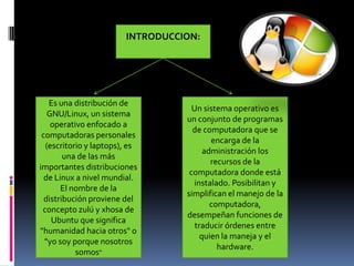 Este documento proporciona información sobre Ubuntu, una distribución de Linux. Se describe que Ubuntu es una distribución enfocada en la facilidad de uso y experiencia del usuario. También incluye detalles sobre las características, software, versiones y organización del software de Ubuntu.