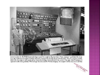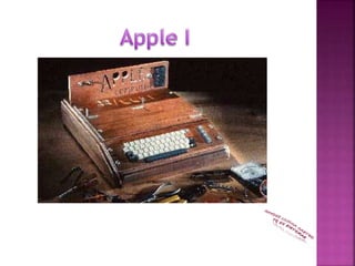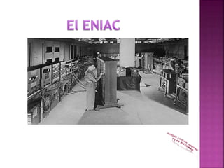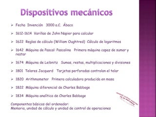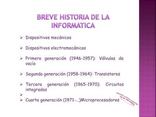 El documento describe la historia de los dispositivos y generaciones de computadoras, desde dispositivos mecánicos hasta la cuarta generación de microprocesadores. También menciona algunas de las máquinas más importantes en el desarrollo de la computadora, como la máquina diferencial y analítica de Charles Babbage y la máquina de Pascal.