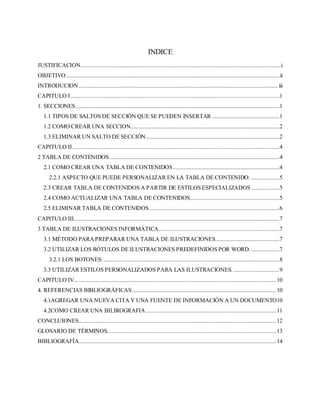 Este documento describe cómo usar diferentes herramientas en Microsoft Word como secciones, tablas de contenido, ilustraciones y referencias bibliográficas. Explica que las secciones permiten establecer formatos de página diferentes para dividir un documento, y cómo crear y eliminar saltos de sección. También cubre cómo crear una tabla de contenido para mostrar la estructura de un documento, y cómo agregar y actualizar tablas de ilustraciones y referencias bibliográficas.