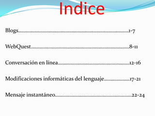 Este documento proporciona información sobre varios temas relacionados con la comunicación en línea, incluyendo blogs, webquest, conversaciones en línea, modificaciones del lenguaje en Internet y mensajes instantáneos. Se enfoca principalmente en describir la historia y funcionalidades de Blogger, uno de los primeros servicios de blogs en línea.