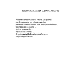 El 15 de mayo se celebra el Día del Maestro en México en honor a los maestros del país. Este día fue decretado en 1917 por el presidente Venustiano Carranza y ofrece varias formas para que estudiantes y padres celebren a los maestros, como presentaciones musicales y de baile, recitar poemas, decorar salones de clase u organizar actividades y regalos significativos para los maestros. También se pueden organizar desayunos o almuerzos especiales así como crear tarjetas de agradecimiento cuando la escuela