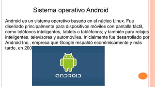 Android es un sistema operativo basado en Linux desarrollado originalmente para dispositivos móviles. Fue creado en 2003 por Andy Rubin y más tarde comprado por Google en 2005. Se ha convertido en el sistema operativo más popular para teléfonos inteligentes a nivel mundial, con una cuota de mercado del 50.9% en 2011. Android ha experimentado numerosas actualizaciones desde su lanzamiento inicial para agregar nuevas funciones y arreglar errores.