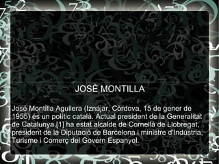 Este documento presenta breves biografías de seis políticos catalanes: Artur Mas, presidente de Convergència i Unió y líder de la oposición en el parlamento catalán; José Montilla, actual presidente de la Generalitat de Cataluña; Joan Puigcercós, político socialista y independentista catalán; Alicia Sánchez-Camacho, presidenta del Partido Popular de Cataluña; Joan Herrera, político ecologista y uno de los fundadores de Iniciativa per Catalunya Verds; y Albert Rivera, político y abogado catalán, fund