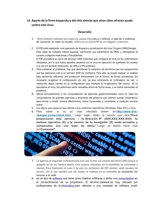 El documento resume la amenaza del virus DNS Changer, que infectó a más de 4 millones de usuarios a nivel mundial. El FBI intervino para limpiar y erradicar el virus, operando servidores DNS temporales mientras se desinfectaban los equipos. Para determinar si un equipo está infectado, se recomienda visitar dns-changer.eu. Una vez identificada la infección, es necesario desinfectar el equipo y restaurar la configuración de red original para asegurar que las peticiones DNS se dirijan a servidores seguros y no