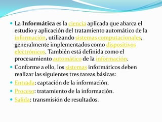 La informática es la ciencia que estudia el procesamiento automático de la información utilizando sistemas computacionales. Los sistemas informáticos realizan tres tareas básicas: entrada, proceso y salida de información. La informática educativa utiliza las herramientas tecnológicas para facilitar la resolución de problemas y potenciar las habilidades cognitivas de los estudiantes.