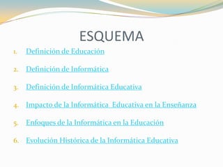 Este documento presenta un esquema sobre informática educativa. Define informática educativa como la disciplina que estudia los efectos de la tecnología de la información en el proceso educativo. Examina los enfoques e impacto de la informática educativa en la enseñanza y ofrece una breve evolución histórica de este campo desde 1920 hasta 2009.