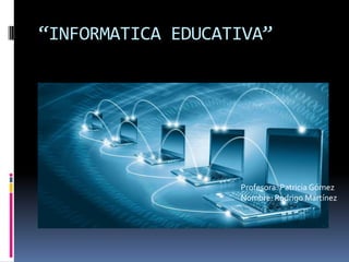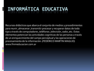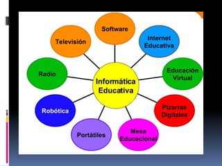 La informática educativa incluye recursos didácticos como computadoras, teléfonos y televisión que potencian las habilidades cognitivas al enriquecer el procesamiento de información. Tiene sus orígenes en dispositivos de cálculo manuales como el ábaco chino y máquinas calculadoras inventadas en los siglos XVII-XIX, y se desarrolló con la electrónica en el siglo XX culminando en la creación del primer ordenador, el ENIAC.