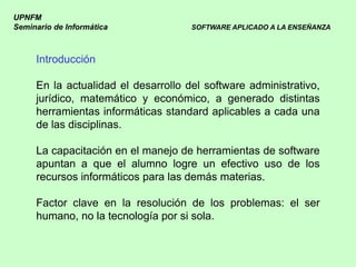 El documento presenta una introducción al software aplicado a la enseñanza. Explica que el desarrollo de software en diferentes áreas ha generado herramientas estándar aplicables a cada disciplina y que la capacitación en el uso de estas herramientas busca que los estudiantes utilicen recursos informáticos en otras materias. También resume brevemente la evolución histórica de la computación desde el 2500 a. C. hasta la actualidad y ofrece una definición de informática según una subsecretaría de información.