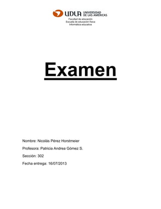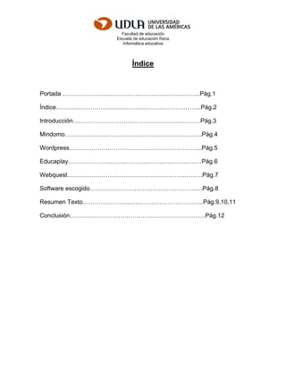 Este documento presenta información sobre diferentes herramientas TIC (Mindomo, Wordpress, Educaplay, Webquest) utilizadas en una clase de informática educativa. Describe cada herramienta detallando sus fortalezas, oportunidades, debilidades y amenazas. También resume una lectura sobre la evaluación educativa y cómo esta revela las concepciones y actitudes del profesor. Finalmente, el documento incluye el nombre del estudiante, profesora, sección y fecha de entrega.