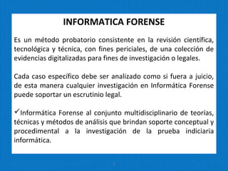 Este documento describe los principios fundamentales de la informática forense. Explica que la informática forense es un método de análisis científico, tecnológico y técnico de evidencia digital con fines periciales o legales. También define conceptos clave como evidencia digital, clasificación de evidencia digital, y los roles involucrados en una investigación forense digital como técnicos en escena del crimen, examinadores de evidencia digital e investigadores de delitos informáticos. Además, establece principios como objetividad, autenticidad,
