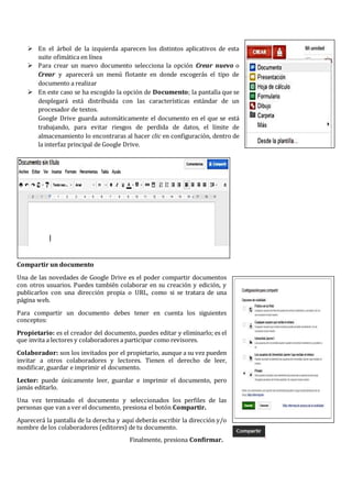 Google Drive es un conjunto de productos de Google que permite crear, editar y almacenar documentos y archivos en la nube y compartirlos con otros. Los usuarios pueden acceder a sus archivos desde cualquier dispositivo con conexión a Internet. Para usar Google Drive, se requiere una cuenta de Gmail y se puede crear y editar documentos en línea usando aplicaciones como procesador de textos.