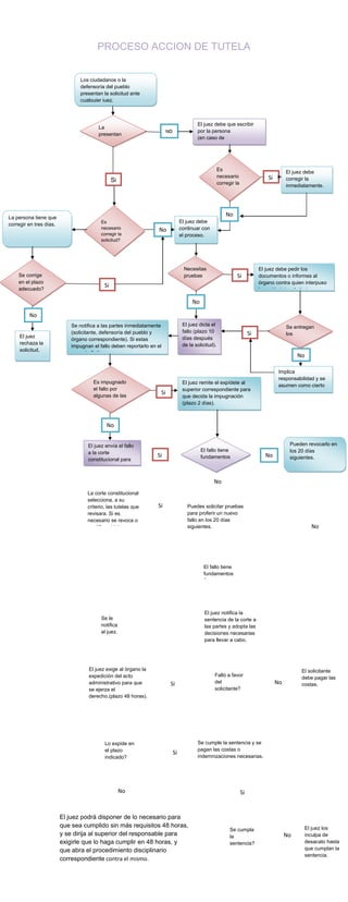 El documento describe el proceso de acción de tutela en Colombia. El ciudadano presenta una solicitud ante un juez, quien luego pide documentos e informes a la entidad contra la que se presenta la acción. El juez dicta un fallo en un plazo de 10 días y lo notifica a las partes. Las partes pueden impugnar el fallo en un plazo de 3 días.