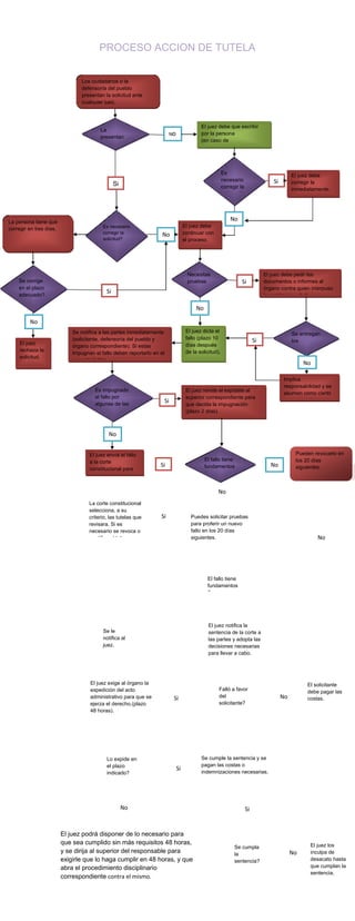 El documento describe el proceso de acción de tutela en Colombia. El ciudadano presenta una solicitud ante un juez, quien luego pide documentos e informes a la entidad contra la que se presenta la acción. El juez dicta un fallo en un plazo de 10 días y lo notifica a las partes. Las partes pueden impugnar el fallo en un plazo de 3 días.