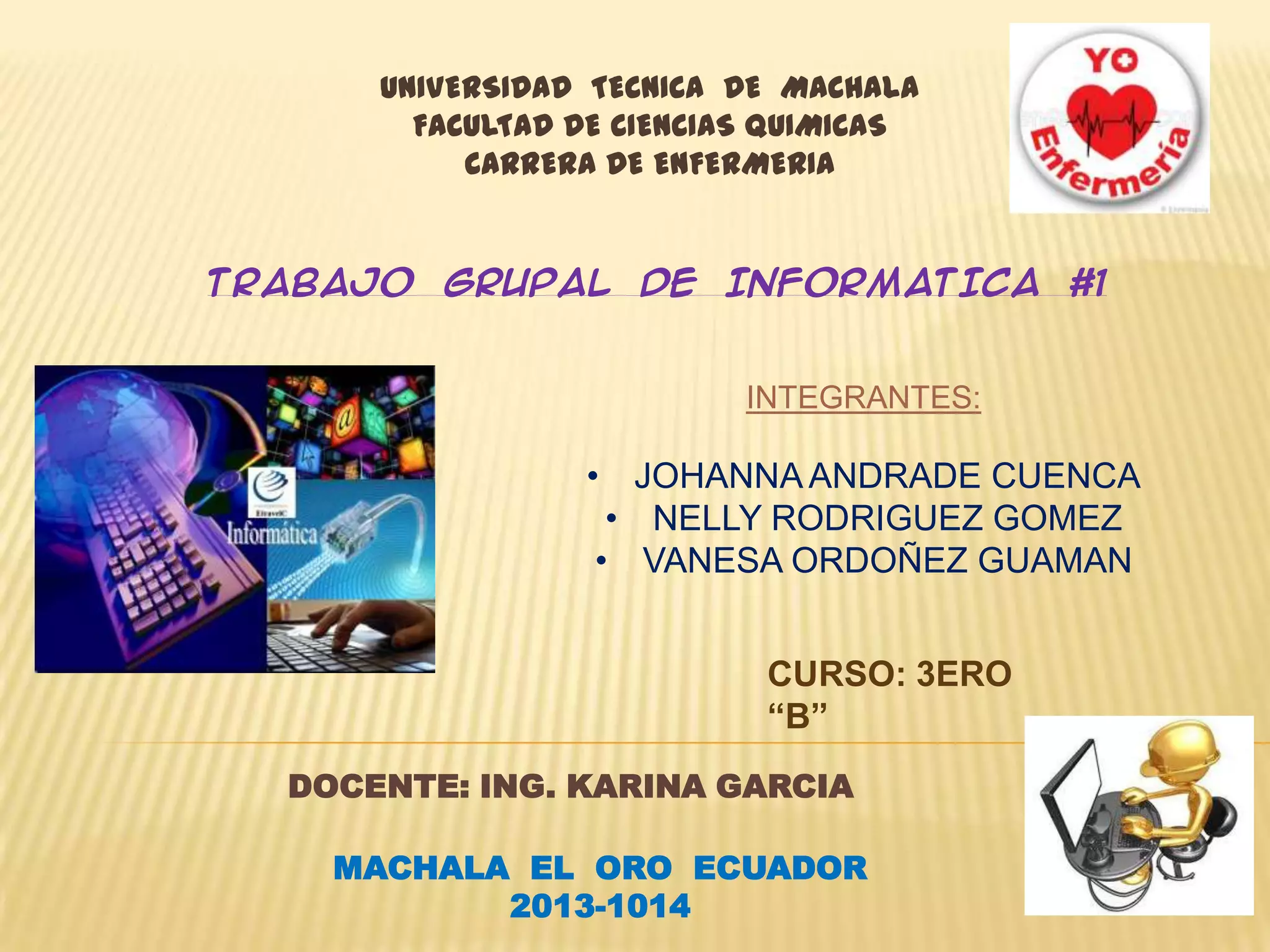 Este documento presenta un trabajo grupal de informática realizado por 3 estudiantes de la carrera de enfermería de la Universidad Técnica de Machala en Ecuador. El trabajo define conceptos básicos de informática como datos, programas, hardware, software, dispositivos de entrada, salida y almacenamiento.