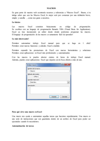 Las macros de Excel permiten automatizar tareas repetitivas mediante código de programación y así ahorrar horas de trabajo manual. Los gráficos de columnas y circulares visualizan datos en Excel, donde las columnas más altas y los sectores más grandes representan valores más altos. Estos gráficos se crean seleccionando datos y usando las herramientas de gráficos en Excel.