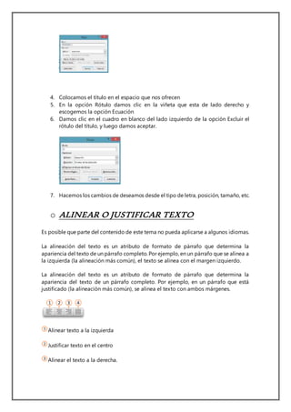 El documento proporciona instrucciones sobre cómo aplicar varios formatos de texto en Microsoft Word, incluyendo cómo crear títulos, alinear y justificar texto, aplicar sangrías, viñetas y numeración, personalizar el fondo, insertar letras capitales, agregar columnas y marcas de agua.
