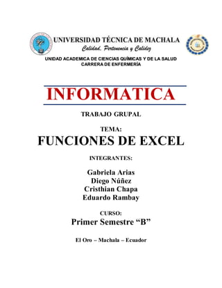 UNIDAD ACADEMICA DECIENCIAS QUÍMICAS Y DE LA SALUD CARRERA DE ENFERMERÍA INFORMATICA TRABAJO GRUPAL TEMA: FUNCIONES DE EXCEL INTEGRANTES: Gabriela Arias Diego Núñez Cristhian Chapa Eduardo Rambay CURSO: Primer Semestre “B” El Oro – Machala – Ecuador