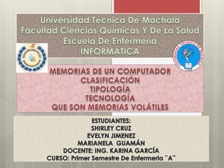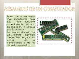 El documento describe los diferentes tipos de memoria y almacenamiento en una computadora. Explica que la memoria RAM es volátil y se usa para almacenar datos temporales, mientras que el almacenamiento como los discos duros es no volátil y ofrece más espacio de almacenamiento a un costo más bajo. También describe los diferentes tipos de memoria como ROM, RAM, unidades de medida y tecnologías de almacenamiento como discos magnéticos y ópticos.