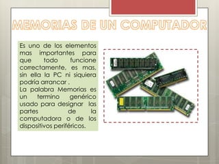 Es uno delos elementos mas importantes para que todo funcione correctamente, es mas, sin ella la PC ni siquiera podría arrancar . La palabra Memorias es un termino genérico usado para designar las partes de la computadora o de los dispositivos periféricos.