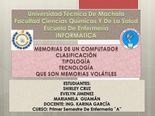 El documento describe los diferentes tipos de memoria en una computadora. Menciona que la memoria es un elemento fundamental para el funcionamiento de una PC y que incluye memoria RAM, ROM, unidades de almacenamiento como discos duros, y diferentes tecnologías de memoria como DRAM, SDRAM, flash y óptica. También explica las unidades de medida para la memoria como bit, byte, kilobyte, megabyte y gigabyte.