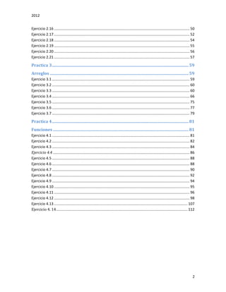 Este documento contiene la descripción de varios ejercicios de programación en C divididos en 4 prácticas. La primera práctica contiene 20 ejercicios sobre operaciones básicas, condicionales y funciones matemáticas. La segunda práctica tiene 21 ejercicios sobre estructuras de repetición. La tercera práctica presenta 7 ejercicios sobre arreglos. Finalmente, la cuarta práctica incluye 14 ejercicios sobre el uso de funciones.
