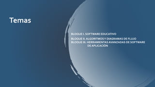 Este documento describe un curso de Informática II de acuerdo con el plan de estudios de la DGB. Se divide en tres bloques principales: software educativo, algoritmos y diagramas de flujo, y herramientas avanzadas de software. El primer bloque evalúa diferentes tipos de software educativos y su uso como apoyo para las actividades académicas. El documento también define conceptos clave como software educativo y sus componentes e funciones.