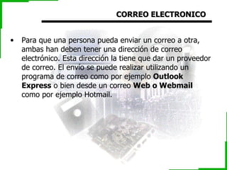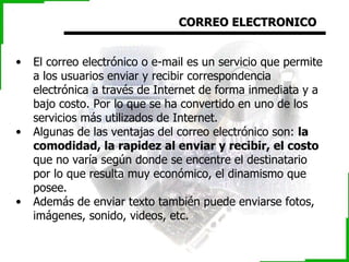 El correo electrónico permite enviar y recibir correspondencia de forma rápida y económica a través de Internet. Una dirección de correo electrónico identifica de forma única a cada usuario y consta de un nombre de usuario, el símbolo "@" y el nombre del servidor y dominio. Existen dos tipos de cuentas de correo: las cuentas webmail que permiten el acceso a través de una página web, y las cuentas POP que requieren de un cliente de correo y almacenan los mensajes en el servidor del proveedor.