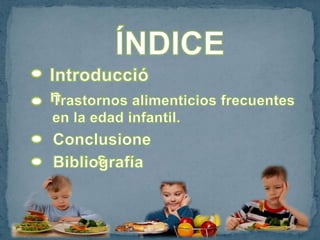 El documento habla sobre la importancia de una alimentación saludable y equilibrada en los niños para prevenir trastornos alimenticios y enfermedades crónicas futuras. Explica que los desajustes nutricionales y la obesidad infantil son problemas graves que han aumentado, y es importante detectar trastornos alimenticios tempranamente para establecer soluciones.