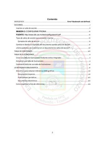 El documento es una guía sobre el uso de Microsoft Word, enfocándose en herramientas como secciones, tablas de contenido y de ilustraciones, con el propósito de facilitar la redacción y organización de documentos académicos y profesionales. Se presentan detalladamente tipos de saltos de sección y sus aplicaciones, así como directrices para la correcta elaboración de referencias bibliográficas. El objetivo general es profundizar en las funcionalidades de Word para optimizar su uso diario entre estudiantes y profesionales.