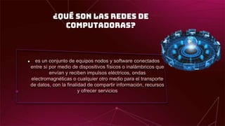 El documento describe los diferentes tipos y topologías de redes de computadoras. Explica las redes de área personal, de área local, de área de campus, de área metropolitana y de área amplia. También describe las redes de área de almacenamiento. Finalmente, menciona las topologías de red más comunes como bus, estrella, anillo, malla, árbol y ad-hoc.