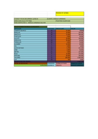 Este pedido detalla los artículos, cantidades, precios unitarios y valores totales de un pedido realizado por Harold Cárdenas. El pedido incluye cemento blanco, barillas, martillos y otros artículos de construcción. El valor total del pedido es de $4,696,100.